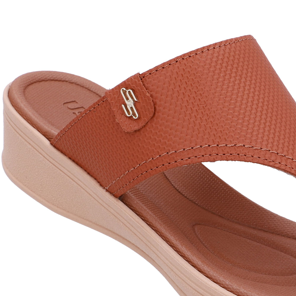Chinelo cabedal em couro mini escama na cor doce de leite. O modelo possui tecnologia Couro, com conforto, maciez e durabilidade.