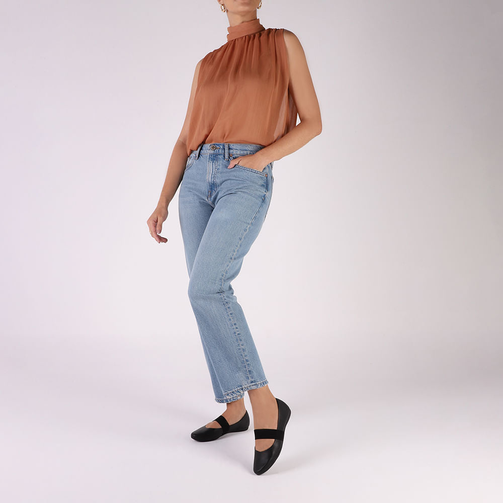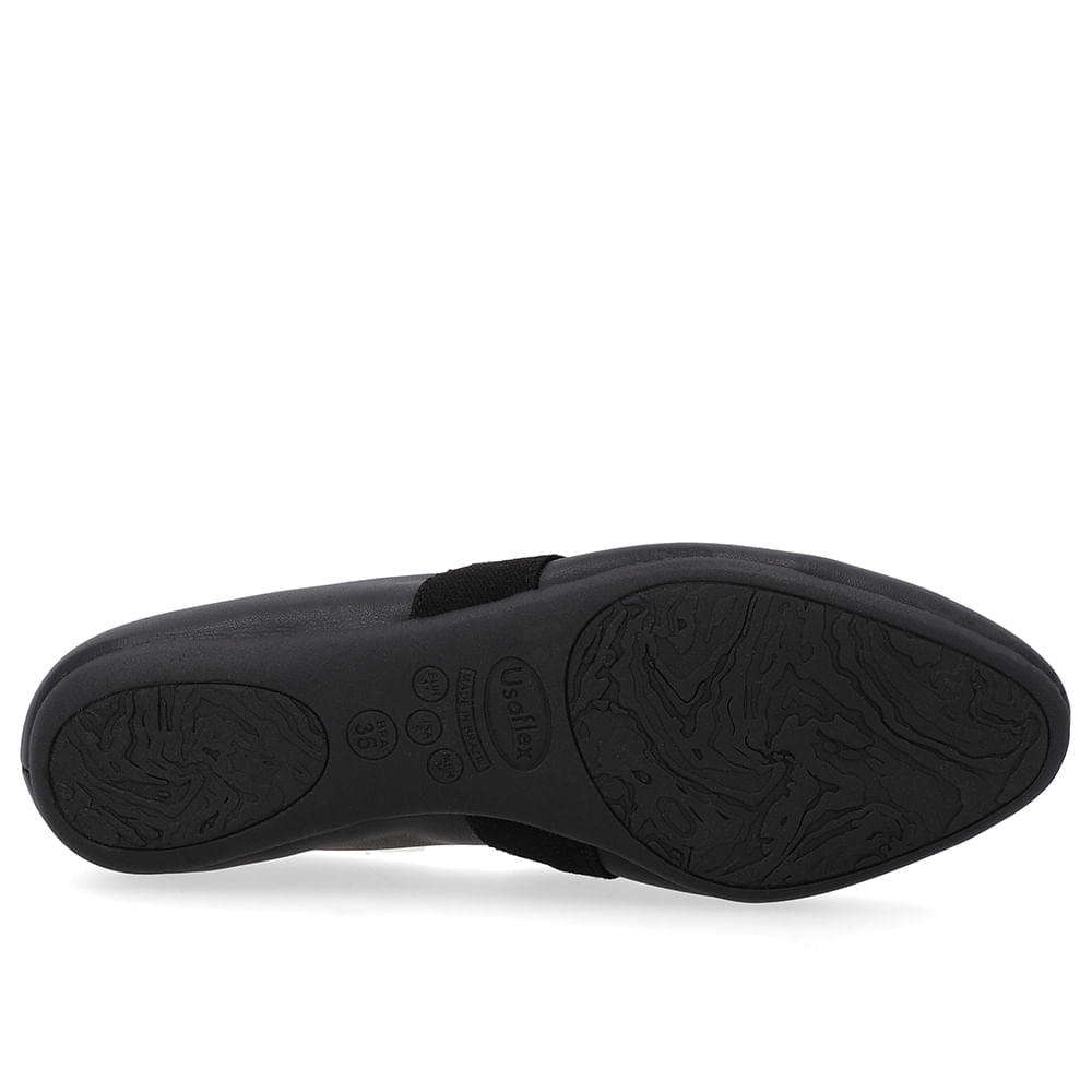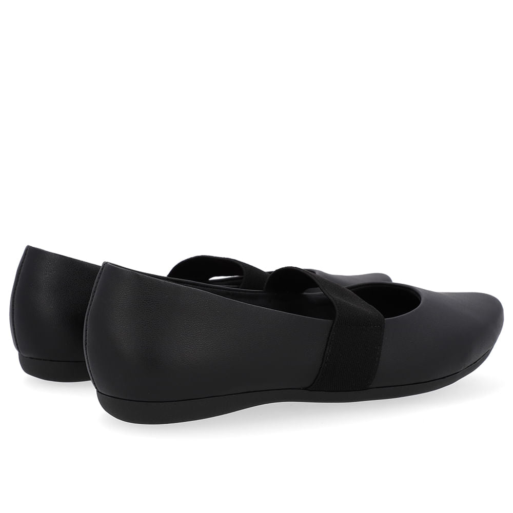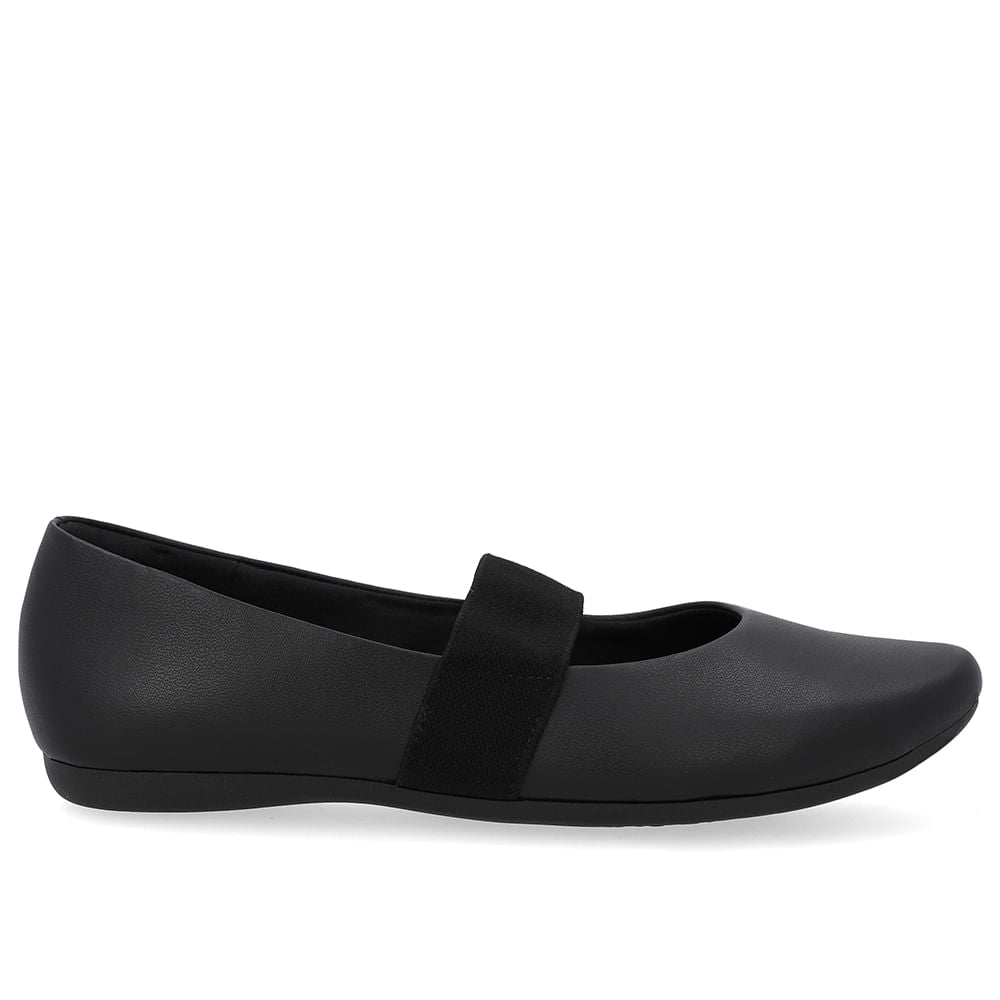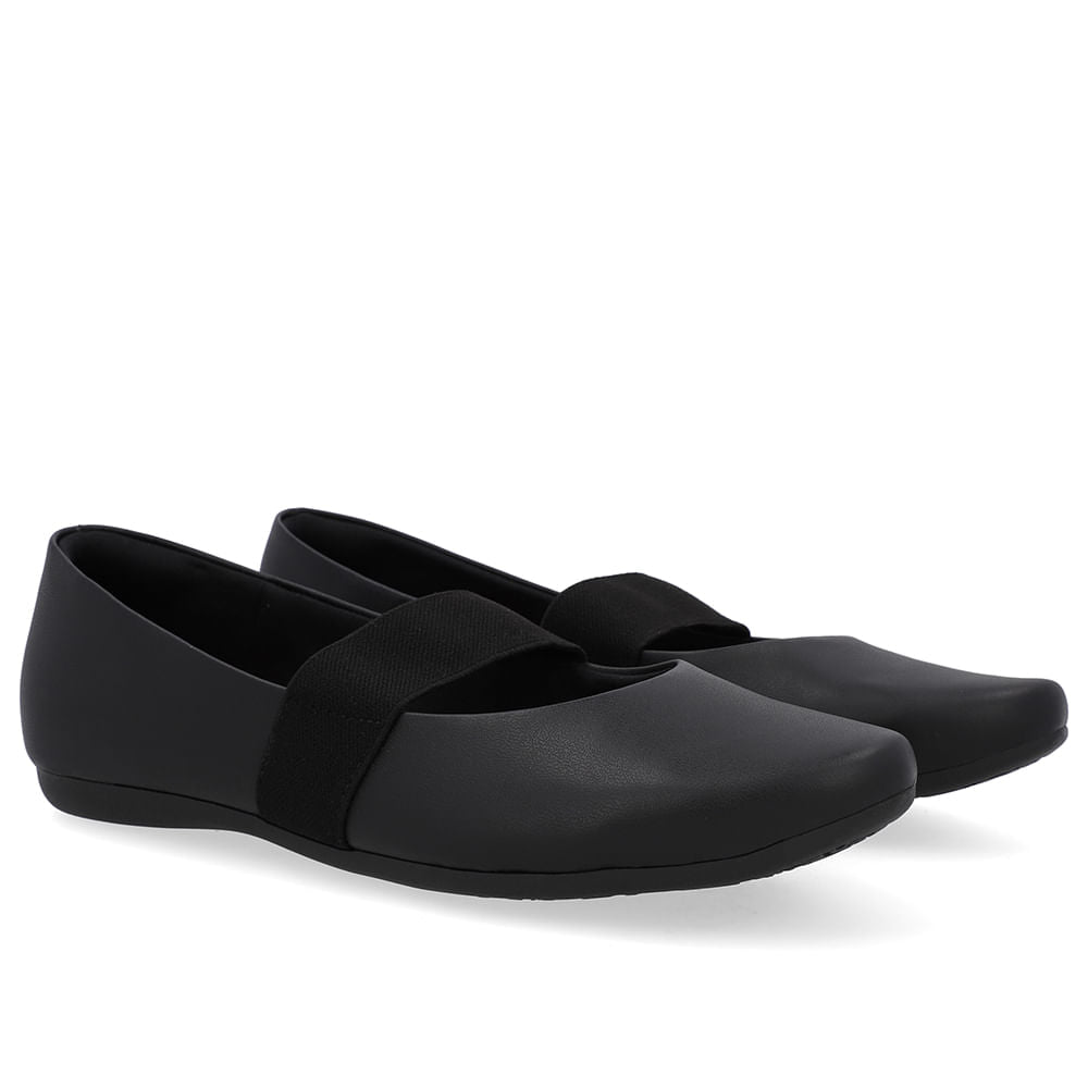 Sapatilha bico redondo em couro liso preto com elástico. O modelo mary jane, que possui o elástico, é um clássico que garante segurança no calce.